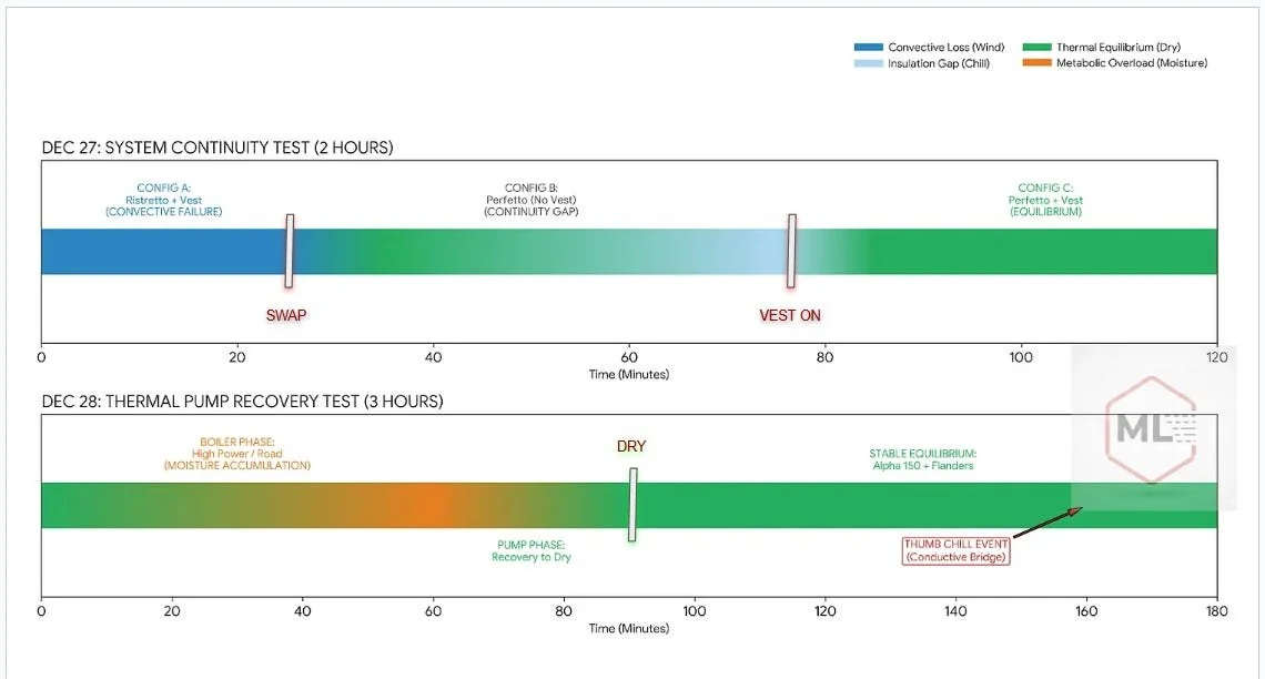The second timeline above depicts the Boiler Phase (orange), where high metabolic output outpaced vapour transmission and moisture accumulated in the system. The pivot point occurred at the 60-minute mark; as I moved into the trails, the Thermal Pump began clearing that moisture. By minute 90, the system achieved Active Recovery to Dry, and remained stable for the rest of the 3-hour ride. Note the red ‘Conductive Bridge’ marker, a localized failure that occurred despite a perfectly functioning core system.